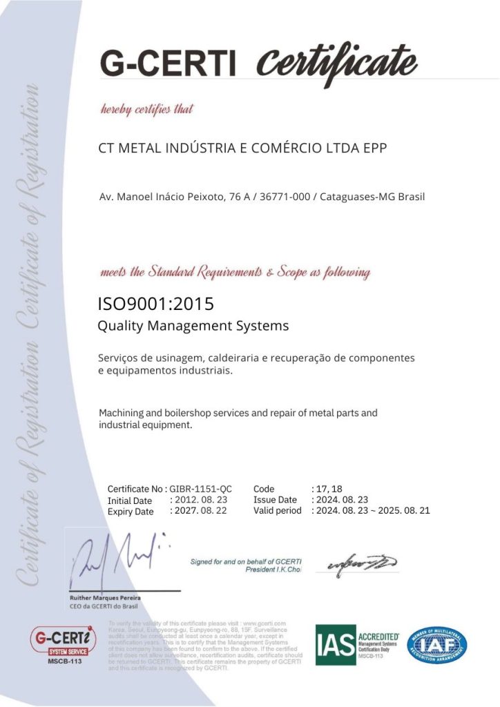 A CT Metal é certificada de acordo com a norma ISO 9001:2015. Visamos sempre a melhoria contínua de nossos processos e qualificação de profissionais, sempre com o objetivo de oferecer o melhor para nossos clientes.